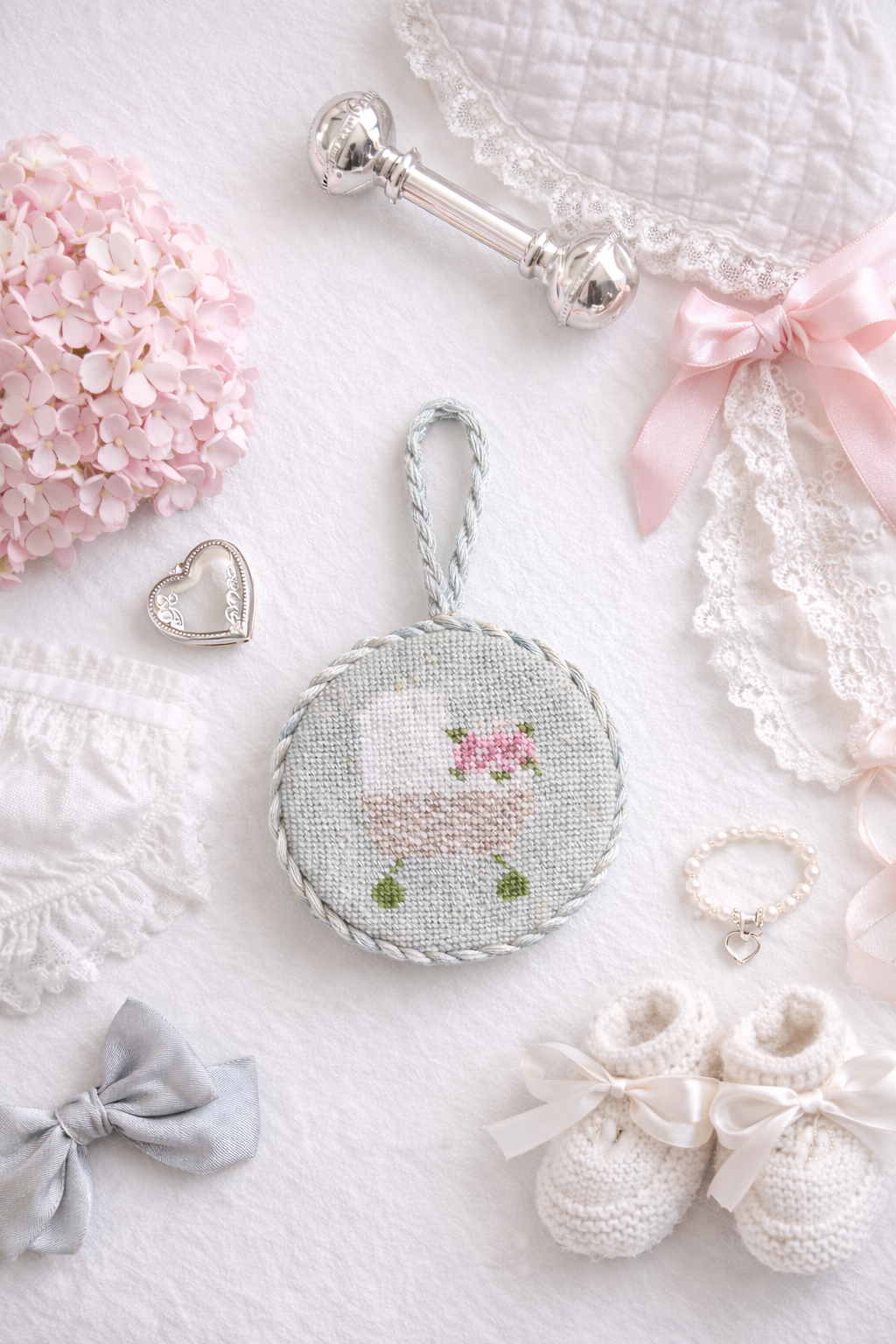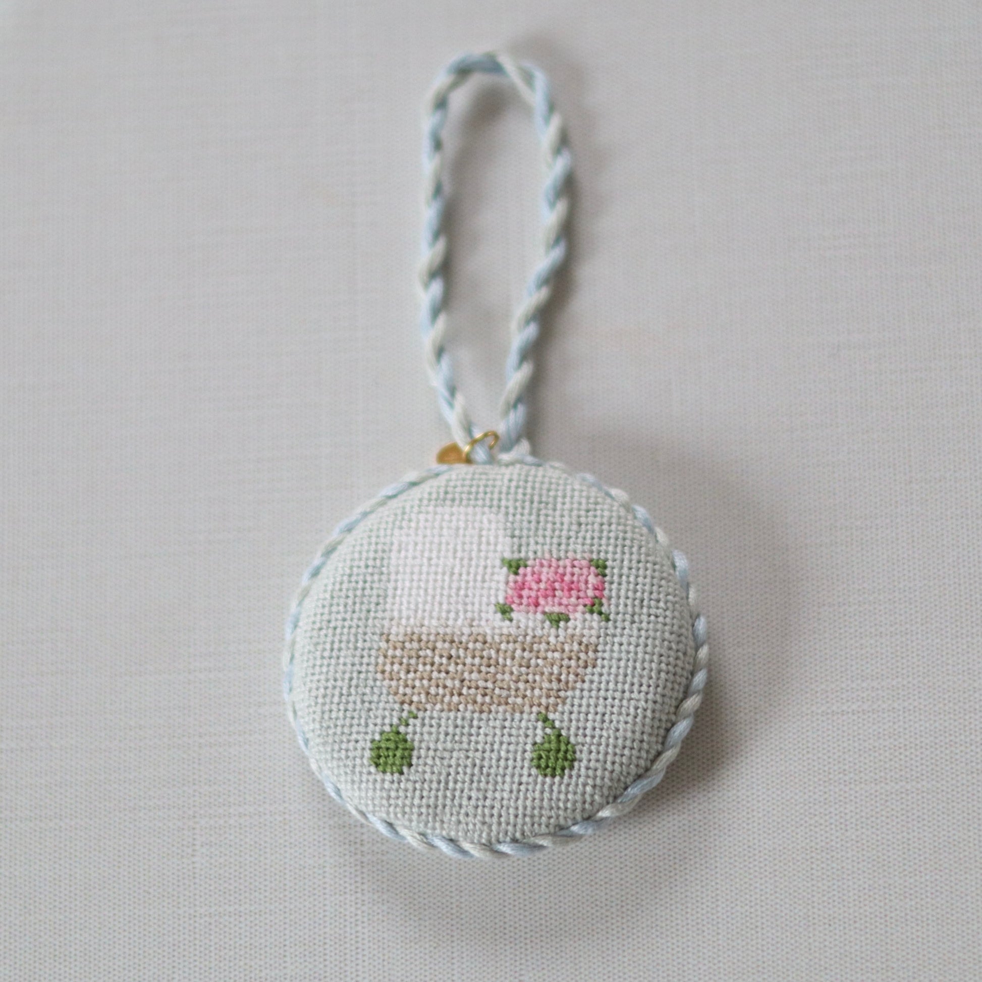 Hand-stitched with care, this fair trade needlepoint ornament captures sweet joy of welcoming a new baby girl. A sweet old-fashioned pram filled with delicate hydrangeas, this ornament is sure to bring joy to your front door wreath, doorknob in the kitchen, or any seasonal décor centerpiece. What a lovely baby shower gift that they will actually want to keep and display in the nursery. So giftable!